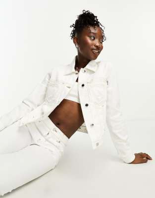 Love Moschino – Kurz geschnittene Jeansjacke in Weiß mit herzförmiger Ziernaht, Kombiteil